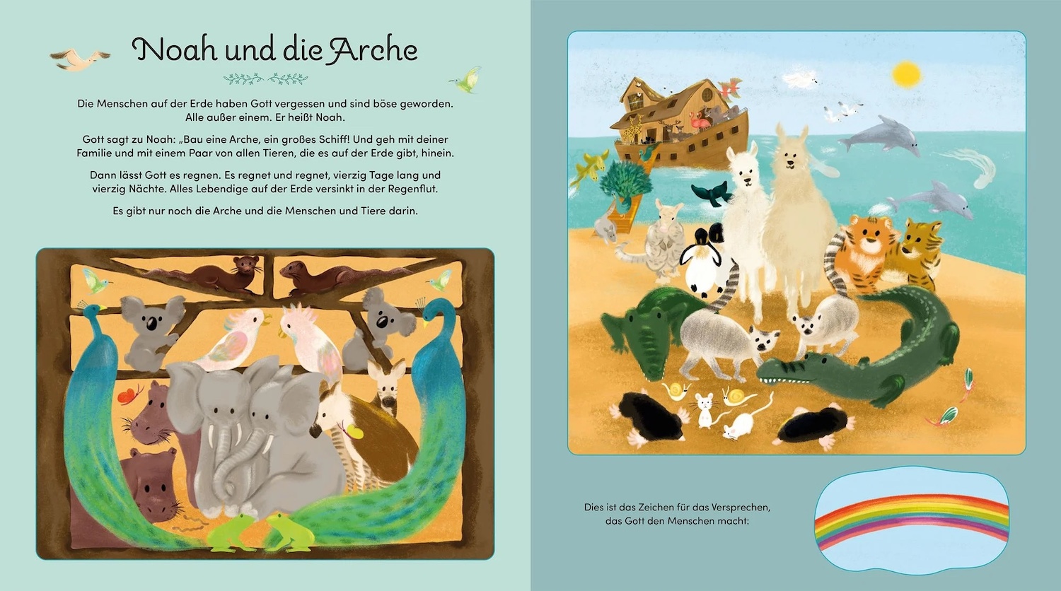 Die biblischen Erzählungen von der Schöpfung, Gottes Versprechen an Abraham, Jesu Geburt, seine Wunder sowie sein Tod am Kreuz und viele weitere können mit „Meine große Bibel“ auf eine aufregende Art und Weise gemeinsam erlebt werden. Die Dreh-, Klapp, Popup- und Ziehelemente sind der ganz besondere Clou dieser liebevoll nacherzählten und farbenfroh illustrierten Kinderbibel. Sie ist ein Bibelbuch voller Überraschungen!